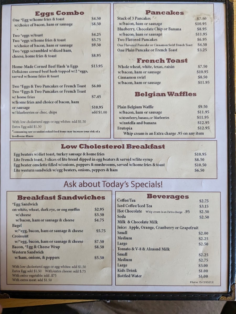 1 egg (any style) w/home fries, toast, om lesterol eggs or egg whites: add $1.00 2 sausage or bacon, & small beverage